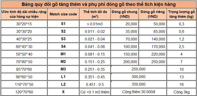 – Chi phí đóng gỗ: Bao gồm vật tư và công đóng gỗ (áp dụng theo biểu phí).