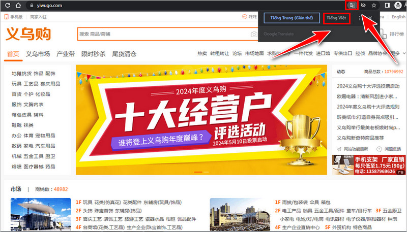 Các bạn click vào link http://yiwugo.com để truy cập vào trang Yiwugo nhanh chóng. Rồi click vào biểu tượng translate ở góc trên bên phải rồi chọn “Tiếng Việt” để chuyển giao diện từ tiếng Trung sang tiếng Việt.